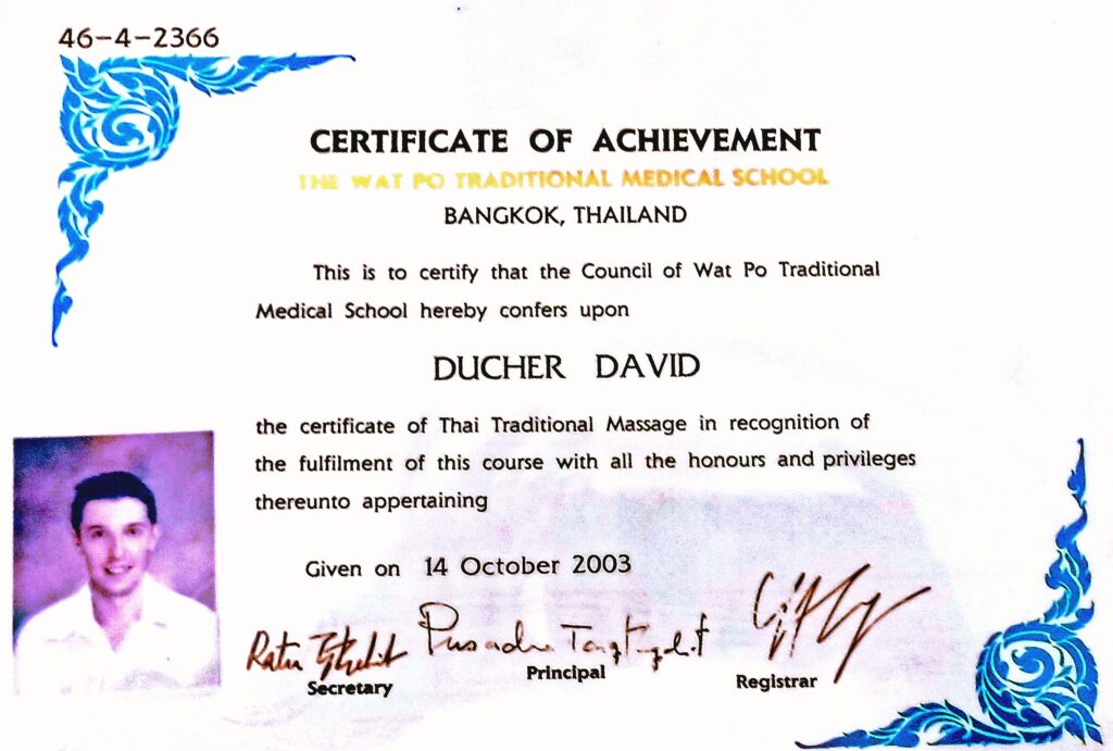 Formateur David Ducher Diplômé en 2003 à l’école du Wat Po Thaïlande